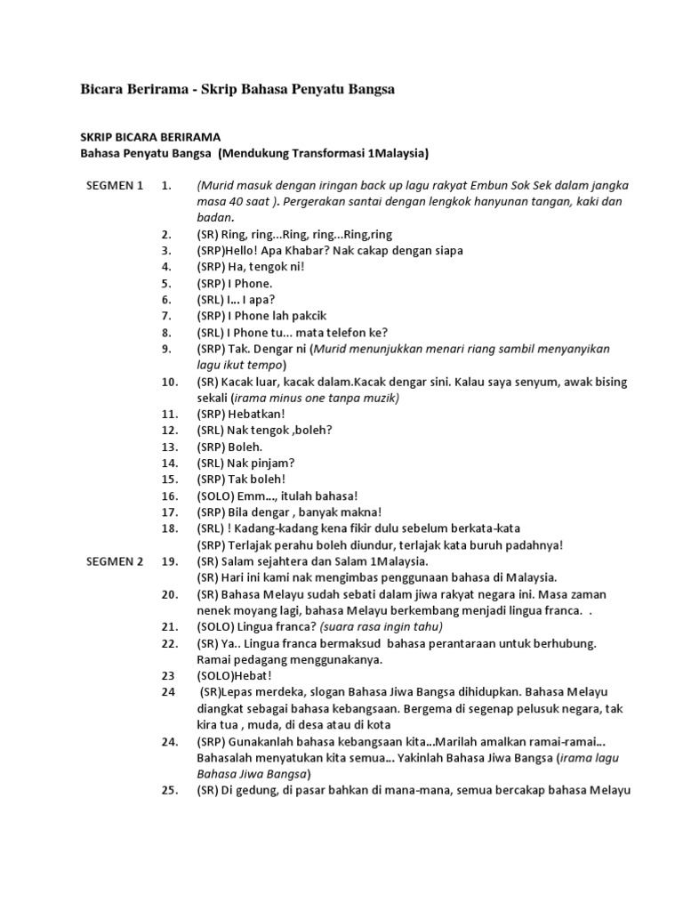 Doc Skrip Bicara Berirama Bahasa Penyatu Bangsa Mendukung Transformasi 1malaysia Siti Halimah Academia Edu