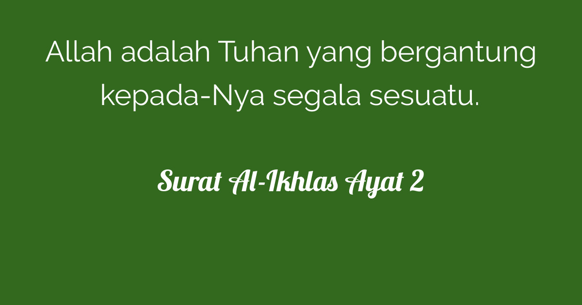 Surah al ikhlas ayat 2 beserta artinya. Surat al ikhlas ayat 2. ا لل ه الص م د allāhuṣ ṣamad allah tempat meminta segala sesuatu. ق ل ه و الل ه ا ح د qul huwallāhu aḥad katakanlah muhammad dialah allah yang maha esa. Arti surat al fatihah adalah surat pembuka al quran ayat pertamanya berarti dengan nama allah yang maha pengasih lagi maha penyayang.